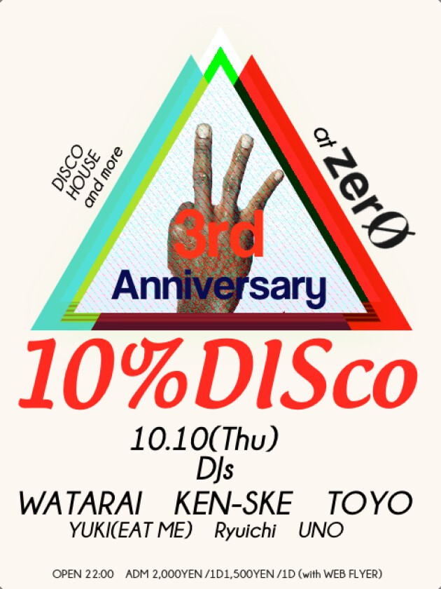 2010年の10月にスタートした"10% DISco"がここZEROで2回目の開催となる今回、めでたく3周年を迎えます。めでたいこの日を出演者一同はしゃぎにはしゃいで皆様をお出迎えしたいと思っております。もちろんHOUSE,DIScoを中心としたGOOD MUSICと気持ちよく踊れて飲めるサイコーな空間でおもてなしをいたします。ぜひ10月10日の木曜日は我々を祝いに来てやってください!