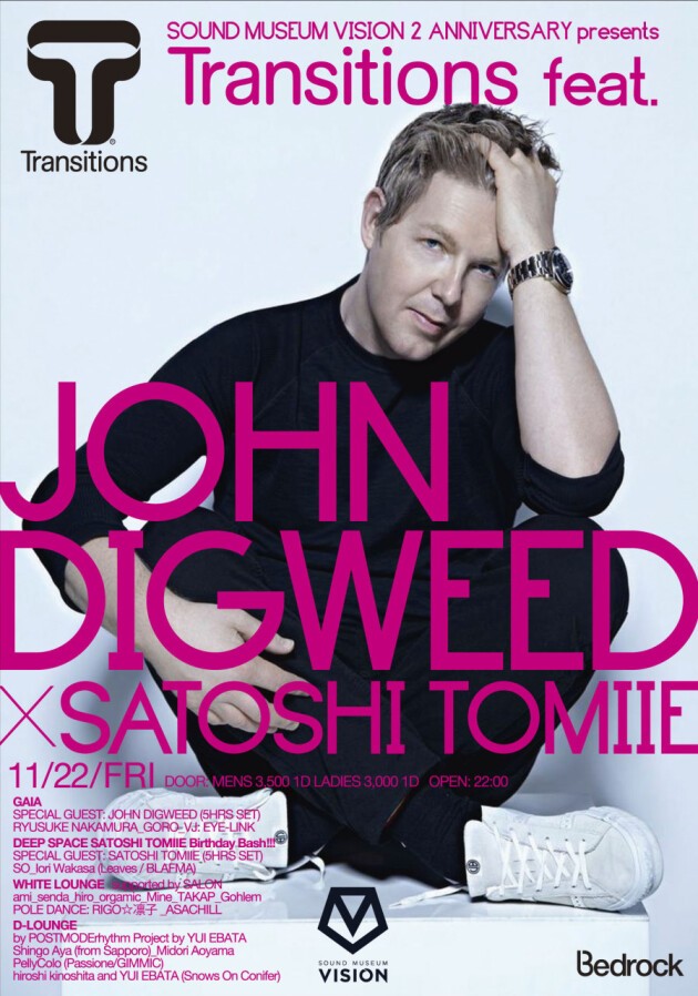2人の世界的アーティストが熱狂と興奮の幕を開くVISION2周年を記念して、ついにスタートする4夜の熱い祝祭。GAIAでその幕開けを飾るのは、言わずと知れた世界最高峰のDJ/プロデューサーJOHN DIGWEEDだ。5月のVISION初登場時に彼が見せつけた圧巻のプレイに酔いしれたオーディエンスにとっては、まさに待望の帰還といえるだろう。王道的グルーヴの中に狂気が散りばめられた、唯一無比の音世界を再び体感してほしい。そしてDEEP SPACEでは、日本が世界に誇るSATOSHI TOMIIEが渾身のロングセットを披露する。グローバルなダンスミュージックシーンの頂点に立つ2人が5時間に渡って繰り広げる、至高の競演を絶対に見逃すな。