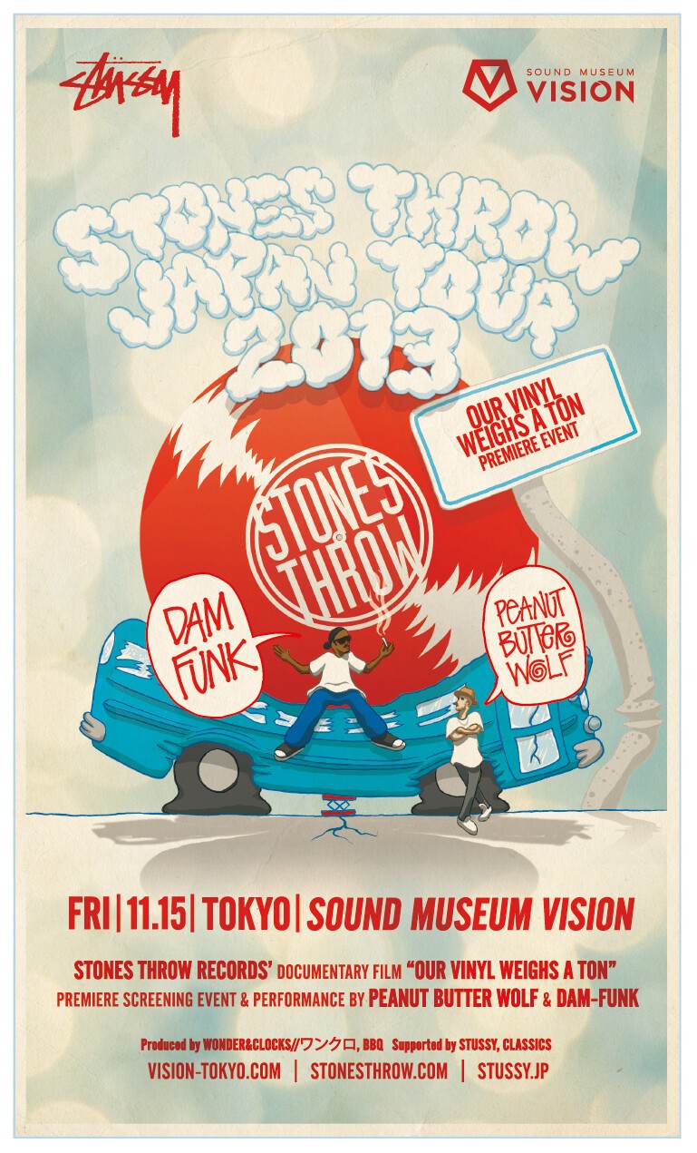 実力派アーティストを次々とVISIONに送り込んできた、西海岸を代表するレーベルSTONES THROW。今回は会場にて話題沸騰中のレーベル・ドキュメンタリー映画「Our Vinyl Weighs A Ton」を日本初公開する!そして、そのマルチな感性を武器にレーベルを主宰し、世界中のミュージックフリークを狂喜させてきたアメリカ西海岸を代表するクリエーター/アーティスト/DJ:ピーナッツ・バター・ウルフが2年ぶりの来日!ミュージックビデオを中心に音楽と映像を見事に融合したライブセット”Video DJ”をVISIONで初披露!さらには、LAからワールドワイドに活躍し、Q-ティップ、DJクイック、ムーディーマン、DJハーヴィー、フランソワ.Kなどジャンルを超えたレジェンド達からも熱いラブコールを受け、STONES THROWから年内にスヌープ・ドッグとのコラボレーション・アルバムという特大リリースも控えるモダンファンク・アーティスト/プロデューサー/DJ:デイム・ファンクの参加も決定!DJセットとソロ・ライヴを披露する!ヒップホップからファンク、ソウルなど幅広い音楽を多角的に投影したSTONES THROWならではのオリジナルなダンスミュージックを存分に体感できる伝説的な一夜となること間違いなし!