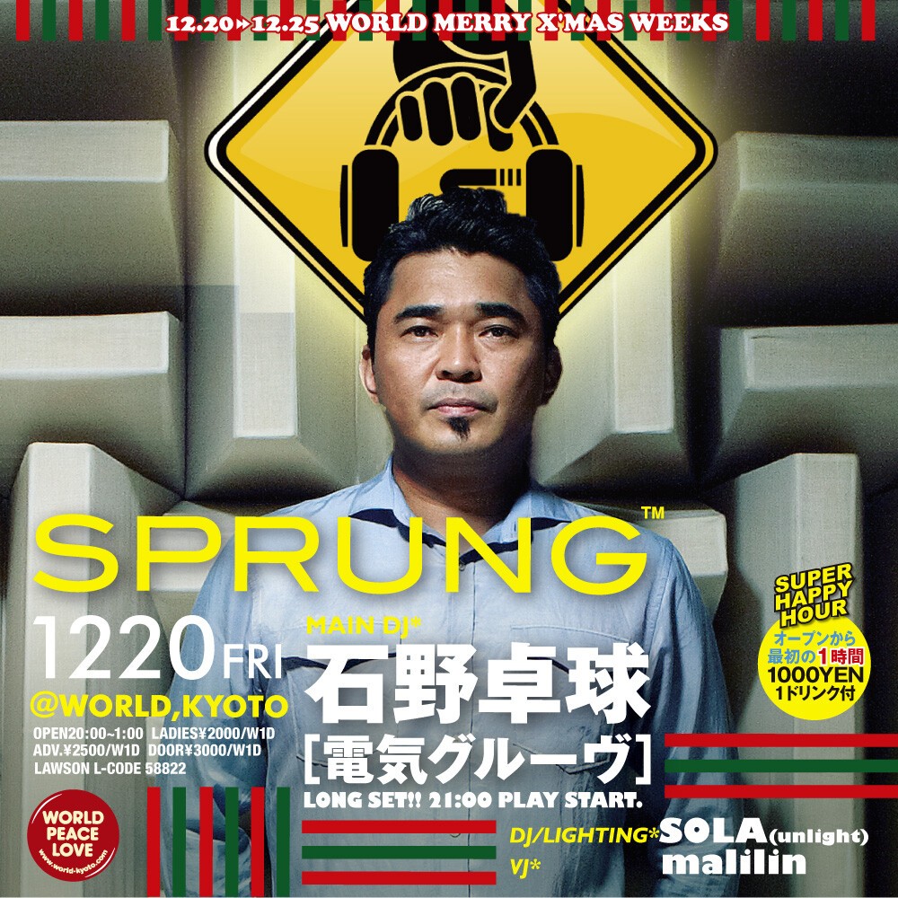 石野卓球が、日本にテクノを布教した。ピエール瀧との電気グルーヴでお茶の間まで持ち込み、日本~アジア最大級のテクノ系フェス“WIRE”で深く、早く、広く、大きく紹介している立役者。前回6月&9月に開催されたSPRUNGは両方共最高潮の熱気で終始ニコニコ&ピースな光景だった!!さぁて、2013年を締めくくる今回はどんなプレイで昇天させてくれるだろう?!卓球先生のテクノ講義に耳を澄ませ、踊り倒せ!!
