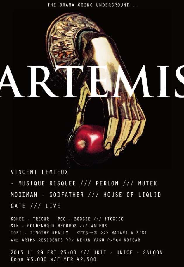 2013年、夏の終わりと秋の間のほんの一瞬に姿を現した’ARTEMIS’。2回目となるパーティを代官山UNIT、SALOON、UNICEの全3フロアを開放して開催!この祝祭の主人公は他でもないクラウドでありそれぞれのドラマが代官山の地下を最高のサウンドと共に燃え上がらせるでしょう。ゲストDJとしてVINCENT LEMIUXが来日、遊び人最前線も納得のラインナップでお届けします。THE DRAMA GOING UNDERGROUND!