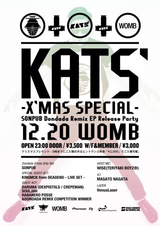 FRESH & started in 2008 and is now at the KATS' SPECIAL party. It will be a party with high class special guests and a culture with a high vogue scene. With a unique LIVE SET and performance show, this mega event is a total party who brings new provocations to audience and production and continues to give sensations. The upcoming KATS' - X'mas Special highlights SONPUB's 2013 creations and DONDADA's REMIX EP RELEASE PARTY. m-flo's ☆TAKU TAKAHASHI and France's new star SAM TIBA, HABANERO POSSE and other DONDADA REMIX in EP compilation are released on the 18th of December and in the same day SONPUB holds the X'mas Ship Set show. Unique lights, images and sound's creations will give you a special time. The SPECIAL GUEST ACT 2013 brings on the appointed day nobody other than KINGMCK from the Korean "DEADEND" who had a tremendous impact on the Japanese scene. It is the first time he will perform a LIVE SET in Japan. Are invited DEXPISTOLS with his DARUMA, SOULJAH and the fantastic DONDADA REMIX, HABANERO POSS E and other guests, the best Japanese DJs. Don't lose KATS' sensational white night!