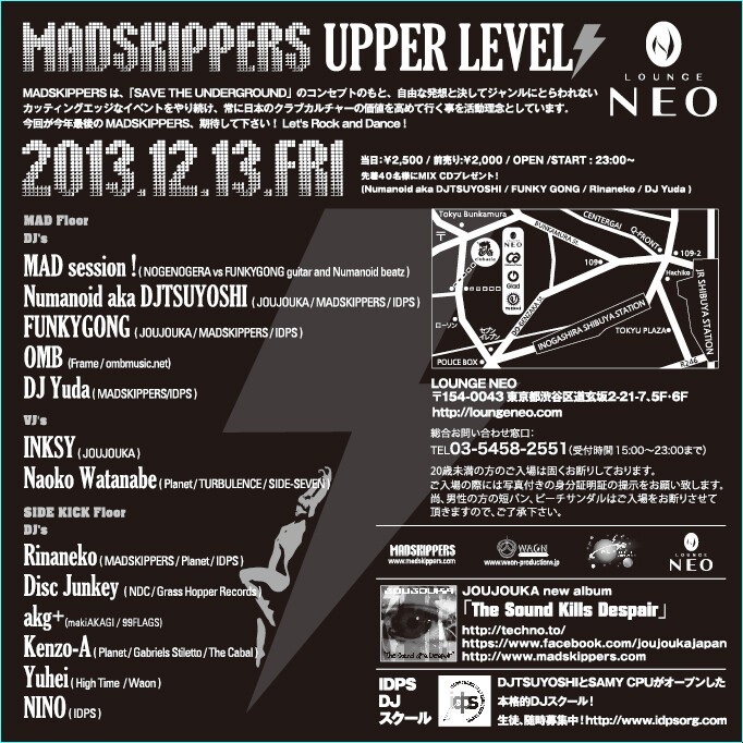 MADSKIPPERSは「SAVE THE UNDERGROUND」のコンセプトのもと、自由な発想と決してジャンルにとらわれないカッティングエッジなイベントをやり続け、常に日本のクラブカルチャーの価値を高めて行く事を活動理念としています。