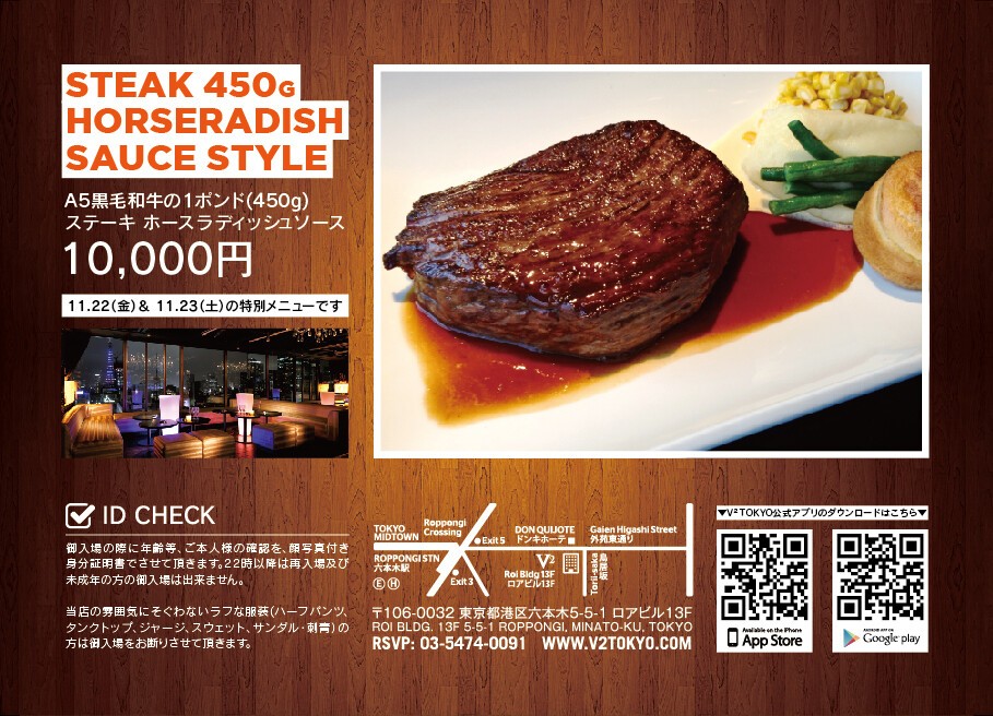 当日限定FoodMenu:【~A5黒毛和牛のステーキ ホースラディッシュソース~1ポンド(450g)】¥10,000