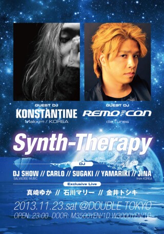 今や世界中のクラブを圧巻させメインストリームのアーティストコラボがアメリカの若者達から人気を集め世界中で爆発的な人気を獲得しヒップホップ以来、 最大のムーブメントとも言われてるEDM.(electric Dance Music) DOUBLE TOKYOにおいて新たに始まるEDM PARTY ”Synth-Therapy”。 これからのシーンを担う若手アーティストフューチャーし日本のクラブシーンの活性化を目指すこのパーティーは日本問わずアジアのDJを積極的にエクスチェンジをする。 そしてゲストには,今やEDM大国ともいえよう韓国よりKonstantineを招聘。 韓国の若手有望DJにてソウルの有名クラブのレギュラーDJを任されており,今後の韓国を 担うアーティストと言えよう。 そして日本に活動拠点をおきアジア圏で活躍が目覚ましく、韓国はもとより、マレーシア、ペナンなどからオファーが絶えないDJ SHOWが緊急参戦決定!!! サイドアクトにはDOUBLE TOKYOのレジデントCARLOが安定感のあるプレイを披露!!! 人種・性別問わず絶大な支持をうけているEDMを 日本にはなかったニューヴィブスでここDOUBLE TOKYOより発信する!!