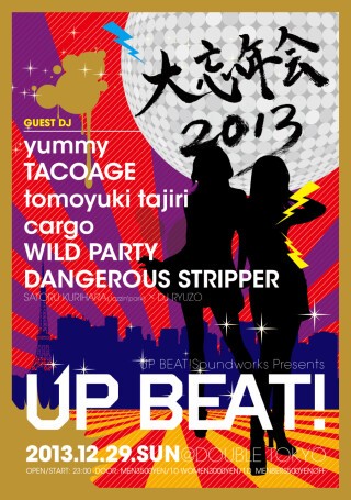 今も尚ロングランし続ける、UPPER DANCE MUSIC PRATY 『UP BEAT!』も2013年の〆として大忘年会を今年も懲りずに開催する… 今年もUP BEAT!SoundWorksは多種多様のclubでイベントを開催し大盛況で終えUP BEAT!の11年目めも波乱なスタートを忘年会から そして今回はUP BEAT!にゆかりのあるGUEST DJsを招致し年を忘れるための忘年会を 西麻布DOUBLE TOKYOにて開催!!! 全く誰が最後まで残るかわからない異種格闘技ともいれる飲み会…イベント…いやパーティーがパーティーアニマル達を歓喜の渦えと巻き込んでいくであろう!!! この一夜にこうご期待!