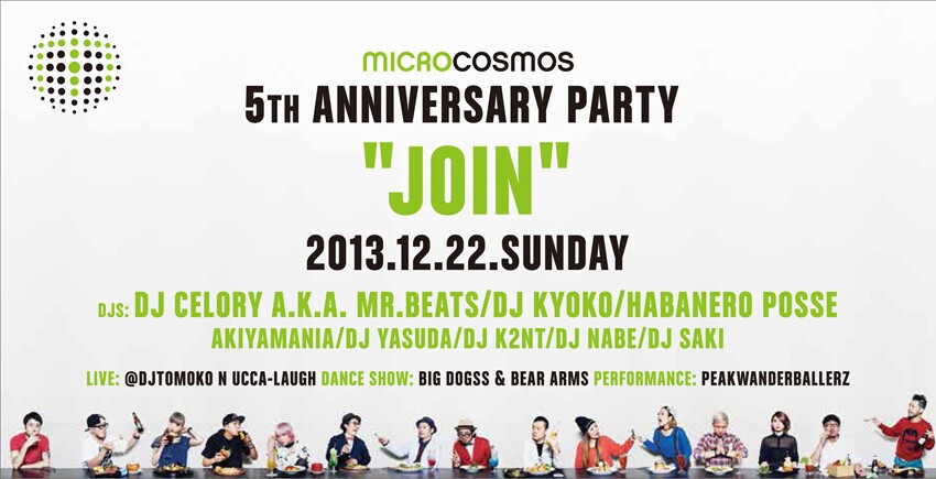 microcosmos に関わる全ての方が総出演!。今年はLIVE ACTに第4土曜日のレギュラーNIGHT PARKから@djtomoko n Ucca-Laugh、PERFORMANCEに世界大会での優勝経験を持つPeakWanderBallerz、DANCE SHOW CASEにはBIG DOGSS & BEAR ARMS今後渋谷を動かすニューカマー達が集結!。またDJ陣にはいつもお茶しているDJ KYOKOやレギュラー陣の総出演!。