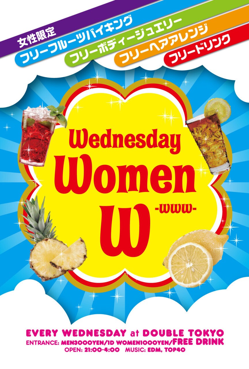 毎週水曜日DOUBLE TOKYOは Ladie`s Nightと題して完全女の子にやさしいサービスを実施しております!!! FREEドリンクはもちろん更にフルーツバイキングそして今流行りのボディージュエリーから、 定番ヘアアレンジまで、すべてが無料になります、一晩で満足度MAXなWWW(トリプルダブル) 最新のEDMからTOP40をすべて網羅しつくしたアーティスト達が参戦決定!!! 西麻布のネクストスタンダード