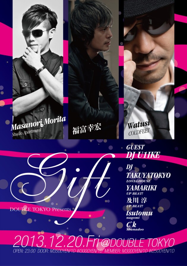 DOUBLE TOKYOが贈る、至高のHOUSE MUSIC PARTY “Gift”!HOUSEをキーワードに年末ならではの豪華ゲストを迎えて開催される!メインアクトを務めるのはいずれも東京のHOUSEシーンを支え作り上げて来た、Studio Apartment、福富幸宏の2人だ。今も尚、東京HOUSEシーンの最先端で活躍を続ける3組のメインアクトに加え、サポートにはTAKUYATOKYO(LOVE&HOUSE),YAMARIKI(UP BEAT!),tsutomu(nagomi)と、共に10周年を迎え、確実に育っている若手が参加しゲストアクトと共に珠玉の一夜を作り上げる。