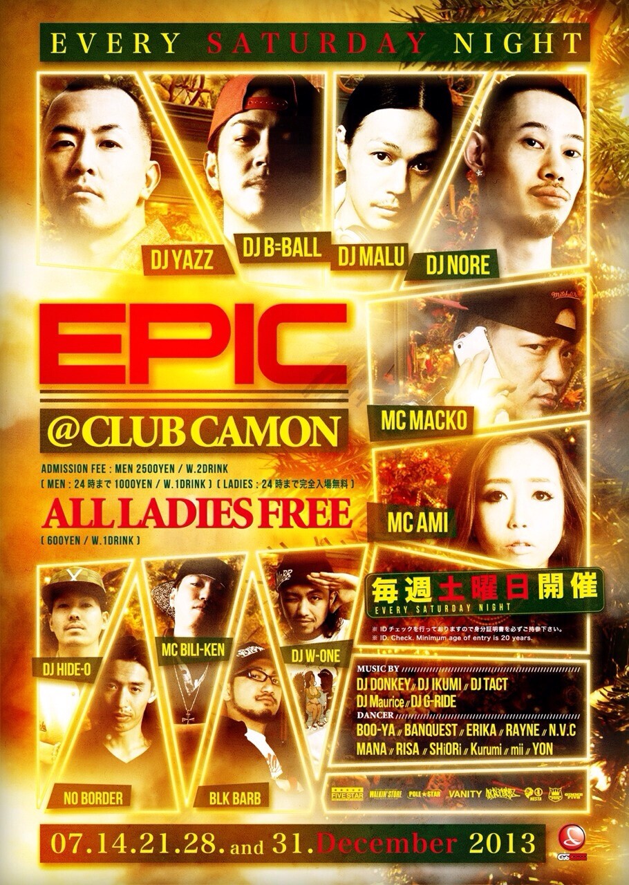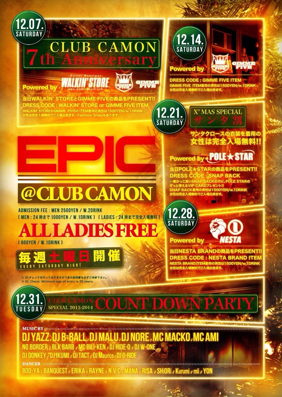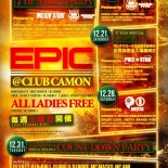 【毎週土曜エピック】クラブカモン7周年記念スペシャル☆☆今夜は豪華プレゼント大放出します!!!!土曜カモンは毎週満員御礼の鉄板ビッグパーティー『EPIC』★★関西を代表する豪華DJ陣が毎週ローテーションで登場☆ジャンルはHIP HOP, R&B, REGGAE, EDM, TOP40など幅広い選曲でお届け☆土曜でも女性は安心の終日入場無料なので是非お洒落して遊びに来て下さい★★