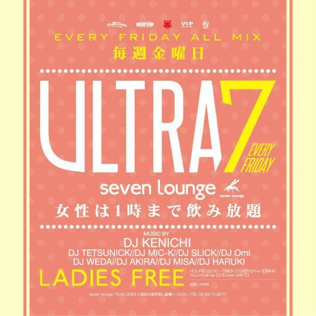 【料金設定】男性 \2,000 w.1D / 女性入場無料 (但し、1DRINK代金のみ頂きます)