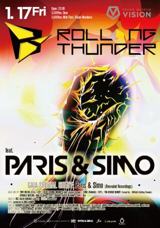 の度にVISIONのフロアを超満員のクラウドで埋め尽くして きた大人気パーティ“ROLLING THUNDER”が、ファン待望の声に応えて3カ月ぶりに還ってくる。今回のメインアクトを務めるのは、2013年度、DJ Mag Top 100DJs で記念すべき初のNo1 を獲得したHardwellが主宰する最重要レーベルRevealed Recordingsにピックアップされたカナダ出身の期待の若手アーティストParis & Simoだ。まさにこのパーティならではの独自の視点が活きた人選といえるだろう。EDMシーンをますます加速させる、彼らの鮮烈なプレイに大いに期待してほしい。