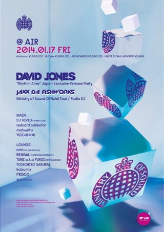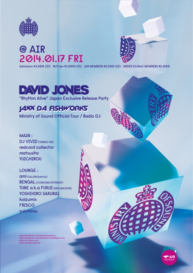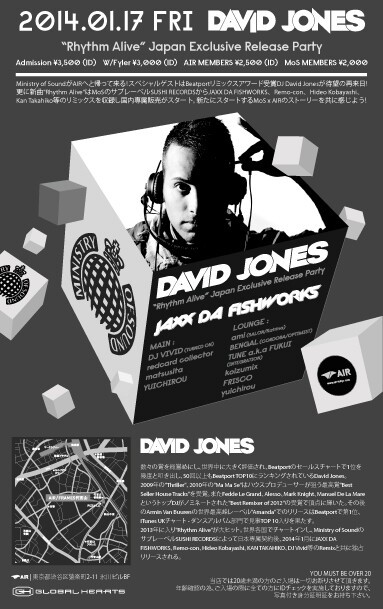 スペシャルゲストはBeatportリミックスアワード受賞DJ David Jonesが待望の再来日!更に待ちに待った新曲"Rhythm Alive"はMoSのサブレーベルSUSHI RECORDSからJAXX DA FISHWORKS、Remo-con、Hideo Kobayashi、Kan Takahiko等のリミックスを収録し国内専属販売がスタート。新たにスタートするMoS x AIRのストーリー第一弾を体験せよ!