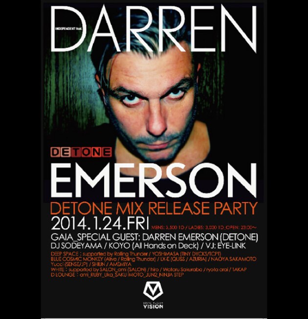 ジャンルを超えて、独創性に満ちたアーティストたちをフィーチュアしていくパーティ“INDEPENDENT”。その2014年の幕開けを華々しく飾るメインアクトは、昨年に続きグローバル・ダンスミュージックシーンのリビングレジェンドDARREN EMERSONだ。不朽の名曲「Born Slippy」で世界中を震撼させた第2期UNDERWORLDの中心メンバーとして活躍し、数多くのアーティストに多大な影響を与えた天才。1年前に魅せたプレイでもVISIONのフロアを彼ならではの感動的なグルーヴで包み込み、集まった数多くのオーディエンスの心を一つにしてくれただけに、待望の凱旋にわれわれの期待は膨らむばかりである。