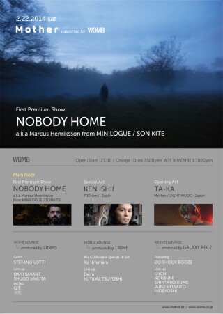 SVEN VATH率いるCOCOON Recordingsに所属するMINILOGUE / SONKITEのメンバーであり、世界中のダンスフリークを躍らせてきたMARCUS HENRIKSSONの新プロジェクト・NOBODY HOMEの日本初登場となる本公演。一夜の物語を共に奏でるのは、活動20周年を迎え、成熟期となった日本のテクノシーンにおいて、他を追随させない先進的な音楽でシーンを牽引し続けるKEN ISHIIとMotherのレジデントDJ・TA-KA。そしてLJ AIBAとVJ HEART BOMBがダンスフロアを光と映像で彩り、Motherらしい色彩豊かな物語を紡ぎます。