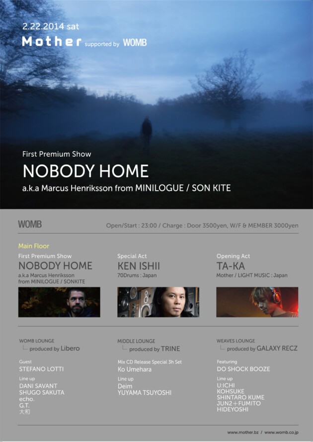 This will be the second collaboration party between Mother and Womb, a hugely successful event that featured Gary Beck as the head runner last year. A special guest for this performance, which will be nearly a year after the last one, will be Marcus Henriksson a.k.a. Minilogue/Son Kite. He fascinated the audience with his organic, yet serious, view of the world which made it look like the pulsations of the Earth and the universe had been fused together, both at Discovery, where people could devote themselves to the grandeurs of nature and experience an extraordinary journey expressed as music, and at Minilogue Night @ Unit, enveloped in a sense of unity through hypnotic and intense music reminiscent of majestic forests. Marcus Henriksson, an artist that has reached dance freaks from all over the world, is a member of Minilogue/Son Kite from Cocoon Recordings, led by Sven Vath. This performance will be the first appearance in Japan of Marcus Henriksson's new project Nobody Home. This event will tell the story of one night, featuring Mother resident TA-KA, and Ken Ishii, who will be welcoming its 20th anniversary of leading the now mature techno scene through advanced music that is well ahead of others. LJ Aiba and VJ Heart Bomb will also bring great light and color to the dance floor, unraveling a story full of color that is so typical of Mother. Totem Traxx's Do Shock Booze will be welcomed as the guest at the VIP Lounge, featuring young and energetic artists such as Coyu and Dosem, also showcasing Galaxy Recz, who has been garnering much attention recently. The Middle Lounge will host the new Trine party, also acting as the release party of Kikyu's Ko Umehara's latest mix CD, featuring Charm's Yuyama Tsuyoshi and Love Henhouse's Deim working together. Womb Lounge, with its deep affinity with Mother, has organized the event by welcoming Stefano Lotti as its guest, invited by Libero, well known for its summer beach party Goonies, and is also giving great attention to the organizers of each floor. Mother will once again be seeking to generate great emotion and excitement in 2014, welcoming you all with even more conceptual offerings.