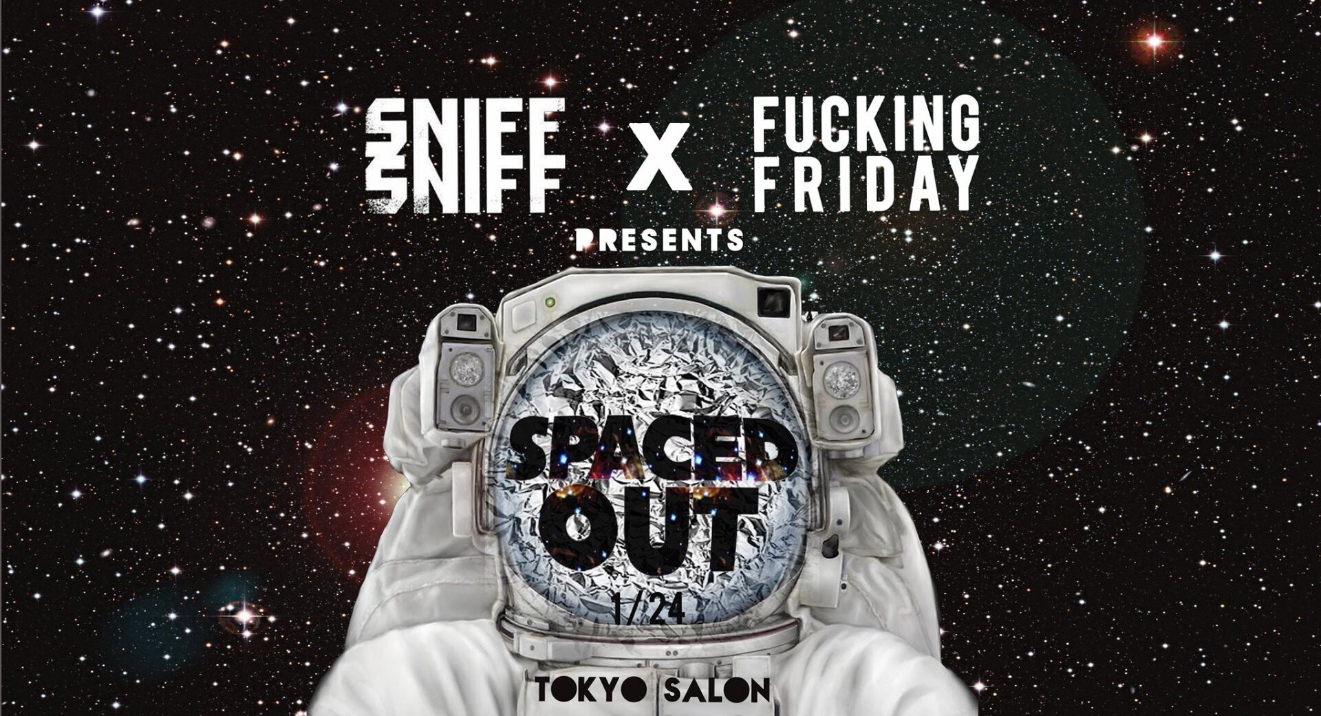 東京で最も良く知られる二大パーティー、Sniff Sniff とFucking Friday がタッグを組んで開催するSPACED OUT!一夜限りのギャラクシープレイグランドに変身する東京サロンを見逃すな。最高のDJラインナップとスペシャルドリンクで待つ。1月24日金曜日22時スタート。エイリアン入場無料。
