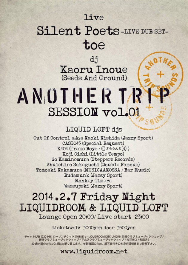 Silent PoetsとtoeのLiveは勿論、DJ陣も両者ならではの東京発クラブ・オルタナティヴ界を担うDJが大集合! さらなるサプライズ・ゲストも追加予定! 国内最強のサウンドシステムを擁するLIQUIDROOMと2FのLIQUID LOFT/Time Out Cafe & Dinerを使ってのフル・ヴァージョンなこのパーティ、Don't Miss it!