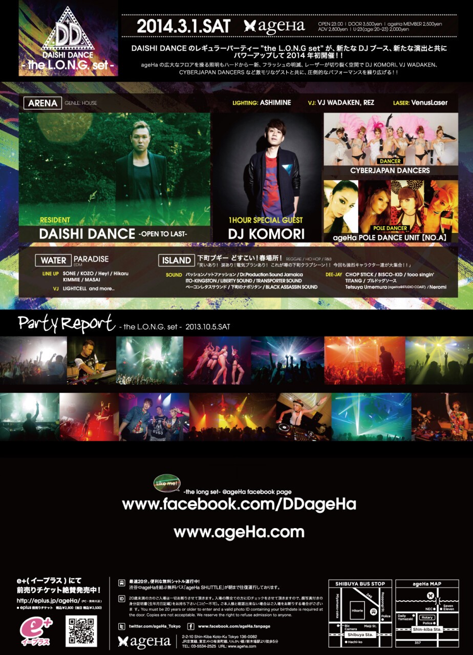DAISHI DANCEのレギュラーパーティー”the L.O.N.G set”が、新たなDJブース、新たな演出と共にパワーアップして2014年初開催!ageHaの広大なフロアを操る照明もハードから一新、フラッシュの明滅、レーザーが切り裂く空間でDJ KOMORI、VJ WADAKEN、CYBERJAPAN DANCERSなど激モリなゲストと共に、圧倒的なパフォーマンスを繰り広げる!!