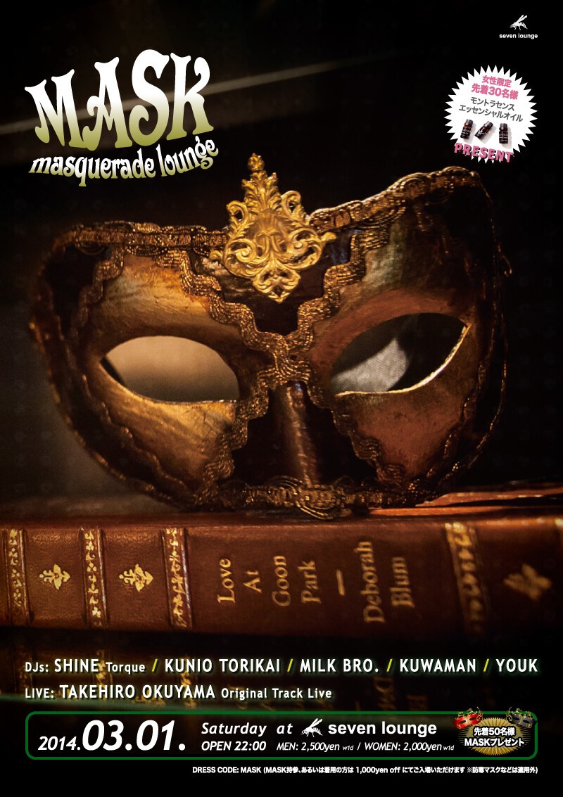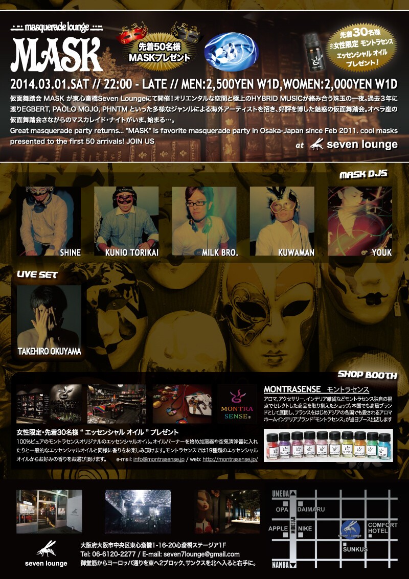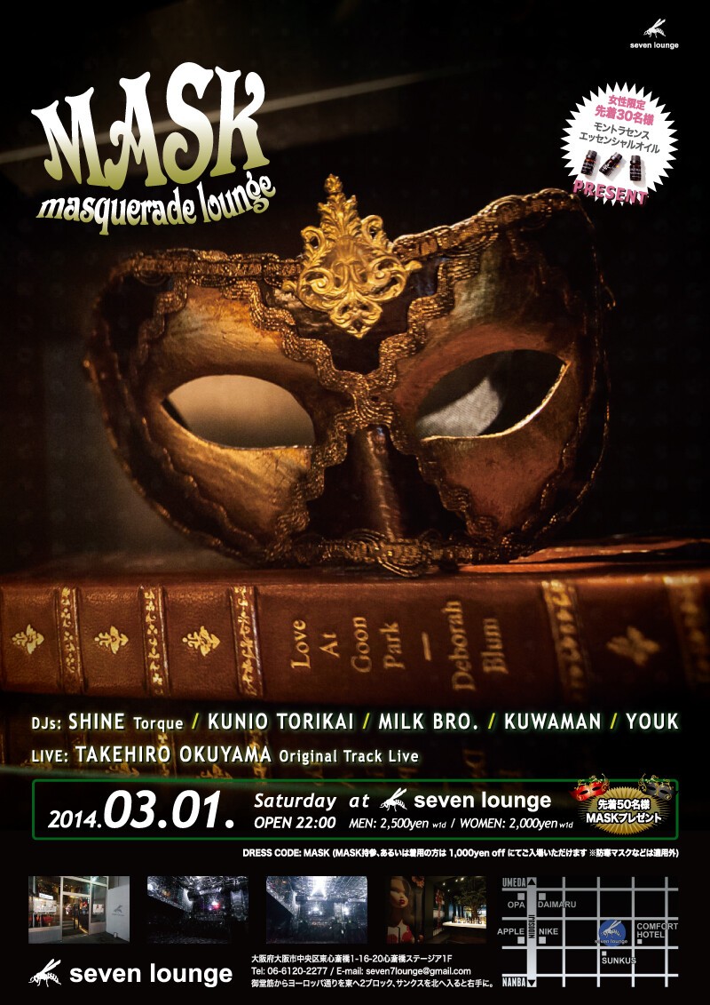 Great masquerade party returns... "MASK" is favorite masquerade party in Osaka-Japan since Feb 2011. cool masks presented to the first 50 arrivals! JOIN US