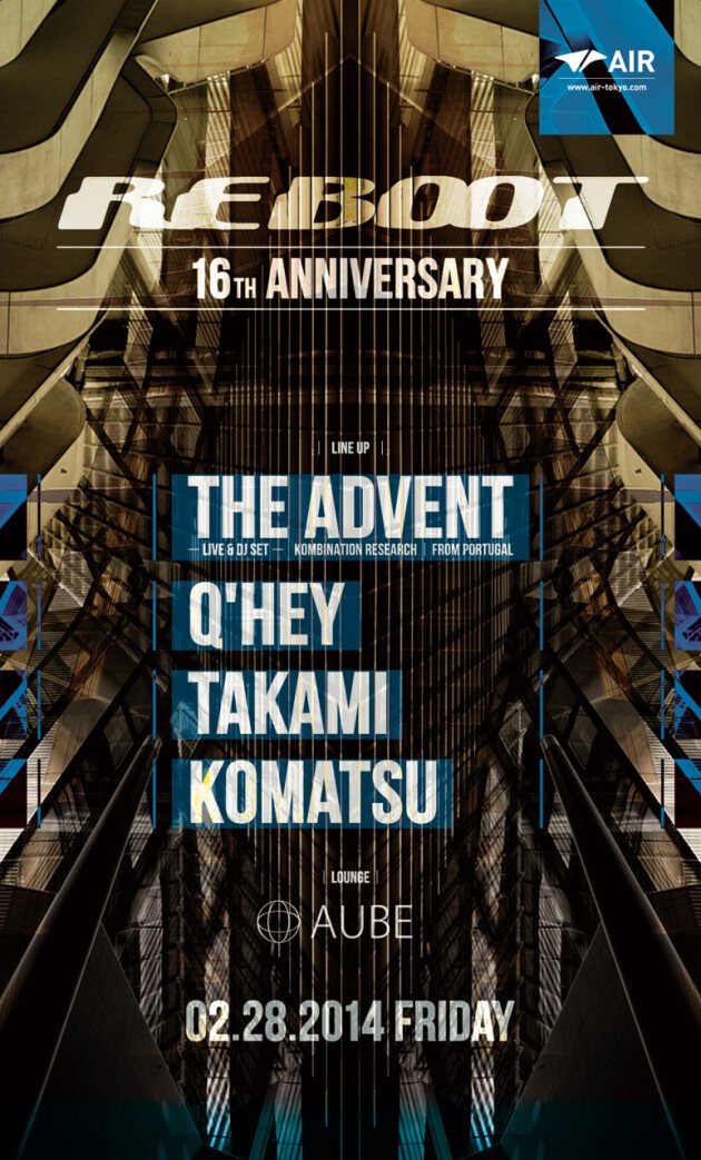 これほど永くオーディエンスに愛され、テンションを落とすことなく疾走し続けてきたパーティが他にあるだろうか?東京テクノシーンの象徴“REBOOT”が、ついに迎える16周年。この特別な夜を祝福するために、ポルトガルから素晴らしいゲストアーティストが久々の来日を果たす。テクノの黎明期から現在まで第一線で活躍し、その楽曲が“REBOOT”のフロアで絶えず愛されてきたThe Adventは、まさにパーティにとってかけがえのない存在といえるだろう。当日は、彼ならではのキャリアとスキルを活かした、圧巻のライヴ&DJパフォーマンスを披露してくれるはずだ。伝説に新たな記念碑が刻まれる瞬間を見逃すな。