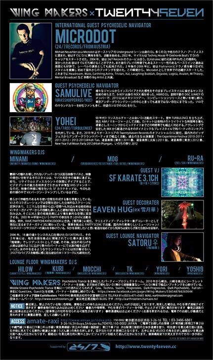 Middle Groove Psychedelic Tranceを軸に一つの流れにとらわれず、Goa、Techno、Suomi、Progressive、Dark Progressive、Dark Psychedelic、Full on…多彩にGuest Live、Guest Djを招聘、パーティーを構築し続けている。