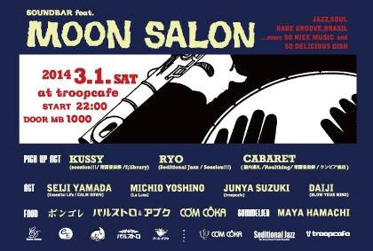 少し大人な音と食のイベント[MOON SALON]!生音を中心に従来のスタイルに少し変化をもたせ"SALON"と言う視点を重視しホームパーティー感覚をオオバコで楽しんでもらおうと席数を増やしユッタリとした空間スタイルを提案しています。音は勿論、ライブ感覚で[MOON SALON]でしか味わえない料理を提供し、各店舗の料理にあわせソムリエが独自の感覚でワインを。全てにこだわったこの[MOONSALON]。 2014年一発目は地元神戸でキャリアを重ね活躍中の3名をピックアップし、更に神戸の夜を盛り上げていきます!極上の音・食・飲をひとつの空間で同時に楽しめるのは[MOONSALON]だけ!