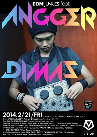 増殖するEDMフリークへ捧げるレギュラーパーティが、この夜始動。“EDM JUNKIES”は、VISIONが自らオーガナイズを手がける新たなキラーコンテンツだ。初回にフィーチュアされるメインアクトは、ジャカルタ出身のDJ/プロデューサーAngger Dimas。2009年にオーストラリアのレーベルVISIOUS RECORDINGSからデビューを果たし、翌年リリースの「SHE GOT IT」がMINISTORY OF SOUND AUSTRALIAのミックスCDに収録されるとともにDavid Guettaのプレイリストに入ったことから、一躍シーンの注目を集めた存在である。日本が世界に誇るSteve Aokiとのコラボレーションも繰り広げる、超新星のプレイを見逃すな。