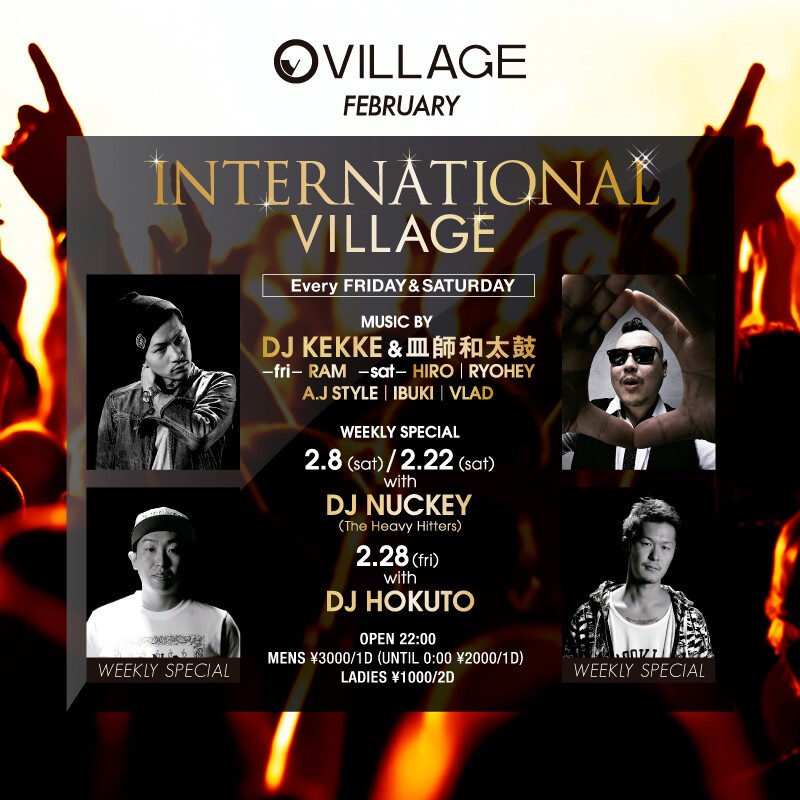 インターナショナルな街、麻布十番。世界水準のDJ陣が発信する音楽と、妖艶なダンサーのSHOW、国際色豊かな人々が集う大人の社交場”VILLAGE”がおくる週末のインターナショナル・パーティー。DJ KEKKE、DJ 皿師和太鼓を軸にアジア、ヨーロッパで活躍するDJ HOKUTO、世界NO'1 HIP HOP DJ集団"The Heavy Hitters"のDJ NUCKEYがスペシャルで登場し、世界水準のサウンドをお届けします。