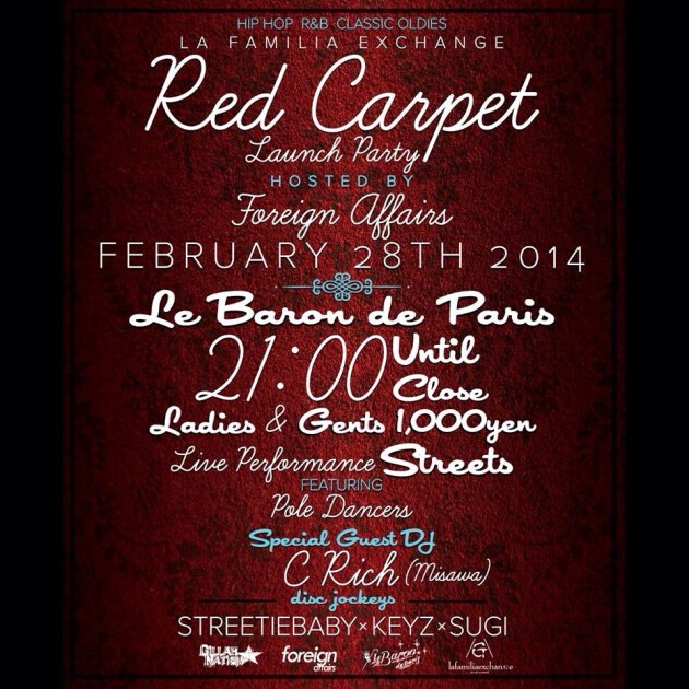 今夜は国際色豊かなメンバーでお届けするRED CARPETローンチパーティー!ニューヨーク仕込みのDJ YUKIJIRUSHIやトラックメーカーとしても活躍するDJ CHIKA aka INHERITなど、日本のDJ界が誇る音師が登場。さらにはヒップホップサウンドに絡めてセクシーなポールダンサーがポールに絡み付く!音楽と美の共演をお楽しみに!