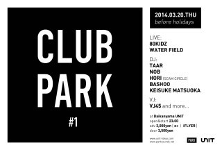 2013年設立後、80KIDZやSCAM CIRCLE、HABANERO POSSEなどの作品をコンスタントにリリース、音楽配信サイトWASABEATの”WASAAWARD 2013”ではベスト・ニュー・レーベルを受賞する等注目を集めるPARKが主催するレーベル・ナイト『CLUB PARK』第一回目の開催が決定。2014年初ライブとなる80KIDZを始め、PARKからデジタルEPをリリースするWATER FIELD、TAAR等が出演する。