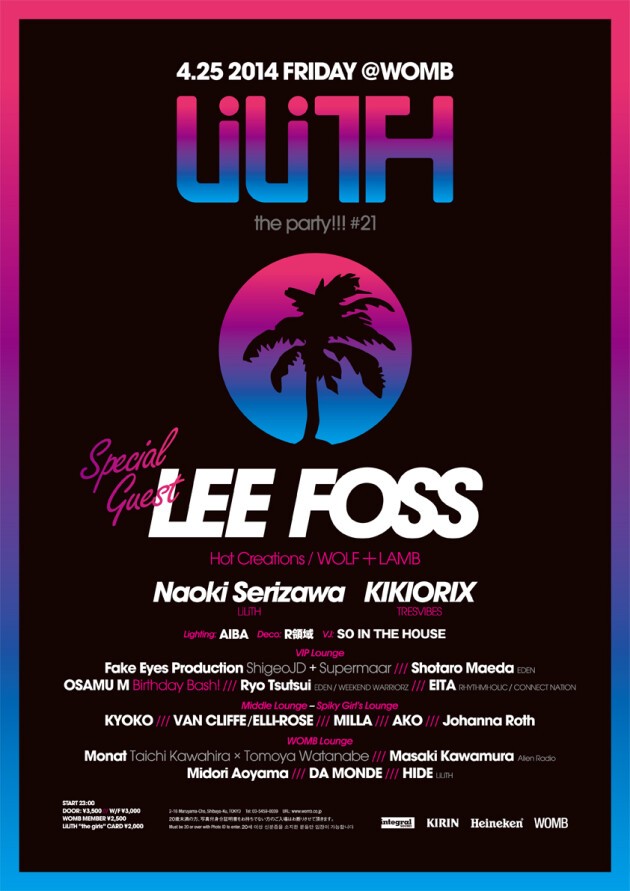 Special guests Jamie Jones and Lee Foss, who is a member of the world-wide popular band Hot Natured and chairman of HOT CREATIONS, will finally make their Japan debuts! LiliTH’s SEXY chief Naoki Serizawa and well-known LiLiTH resident (?) artist and great friend KIKORIX will be lighting up the main floor with cutting-edge house music.