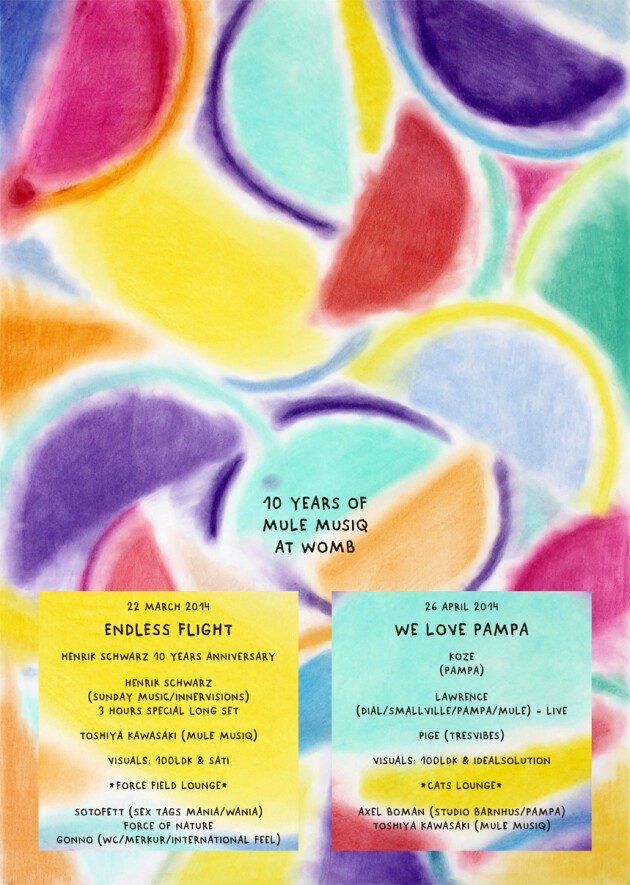 「MICHAEL MAYER がプレイしたテストプレスのイントロを聞いた瞬間、ブースに行って"この曲何?って聞いた曲は KOZE がメンバーの INTERNATIONAL PONY の "LEAVING HOME" だった。ブルーアイドソウルとアシッドなシャッフルビートが世にも奇妙にミックスされたこのクールでポップな曲にノックダウンされたのが2001年の終わ りか2002年の初めだった。そして2001年、今は亡き CISCO HOUSE で KOMPAKT からリリースされた LAWRENCE の 12INCHI を買った。THE DURUTTI COLUMN をハウスにした様な、または LARRY HEARD を繊細にしたような嘆美なサウンドはまさにその頃求めていたものだった。今やベルリンでギャラリーを運営するまでになったLAWRENCE のリリースのアートワークはいつも素晴らしく大きな影響を受けた。KOZE は MULE MUSIQ のことをドリームチームと言ってくれている」-MULE MUSIQ / TOSHIYA KAWASAKI