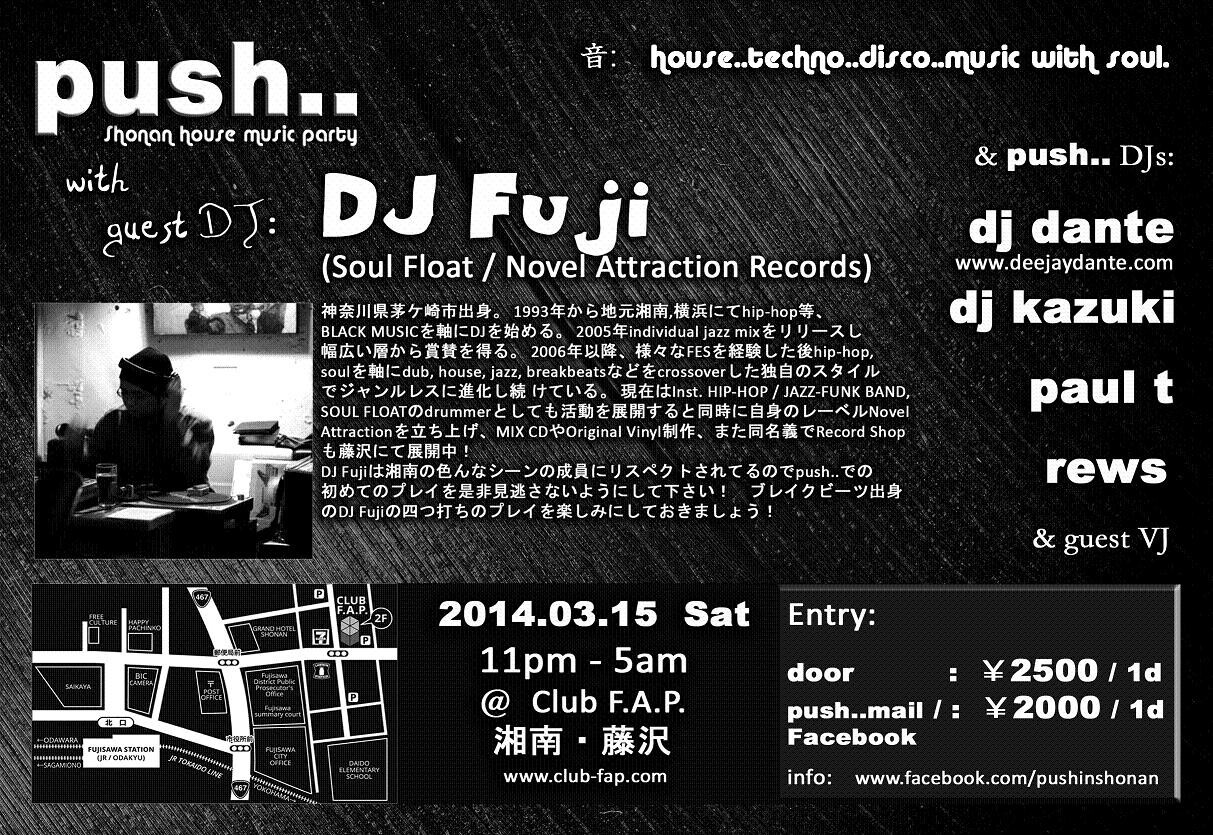 3月になって、段々暖かくなるから冬篭りを辞めて出かけましょう! 3月15日に行う次のpush..のゲストDJはなんと湘南の色んな音楽シーンの成員から賞賛を得るセレクター、DJ Fuji! ヒップホップ、ブレイクビーツを軸に活動してるDJだが、funk/jazz/soul/houseも含めてスキルフルなMIXとユニーク・スタイルでどこでもプレイ出来るDJだから、四つ打ちダンスミュージックがメインのpush..のダンスフロアをどういう風に盛り上げるか楽しみにしていって下さい! 笑顔が沢山あるダンスフロアから離れられない最高の湘南ナイトになることは間違いない!