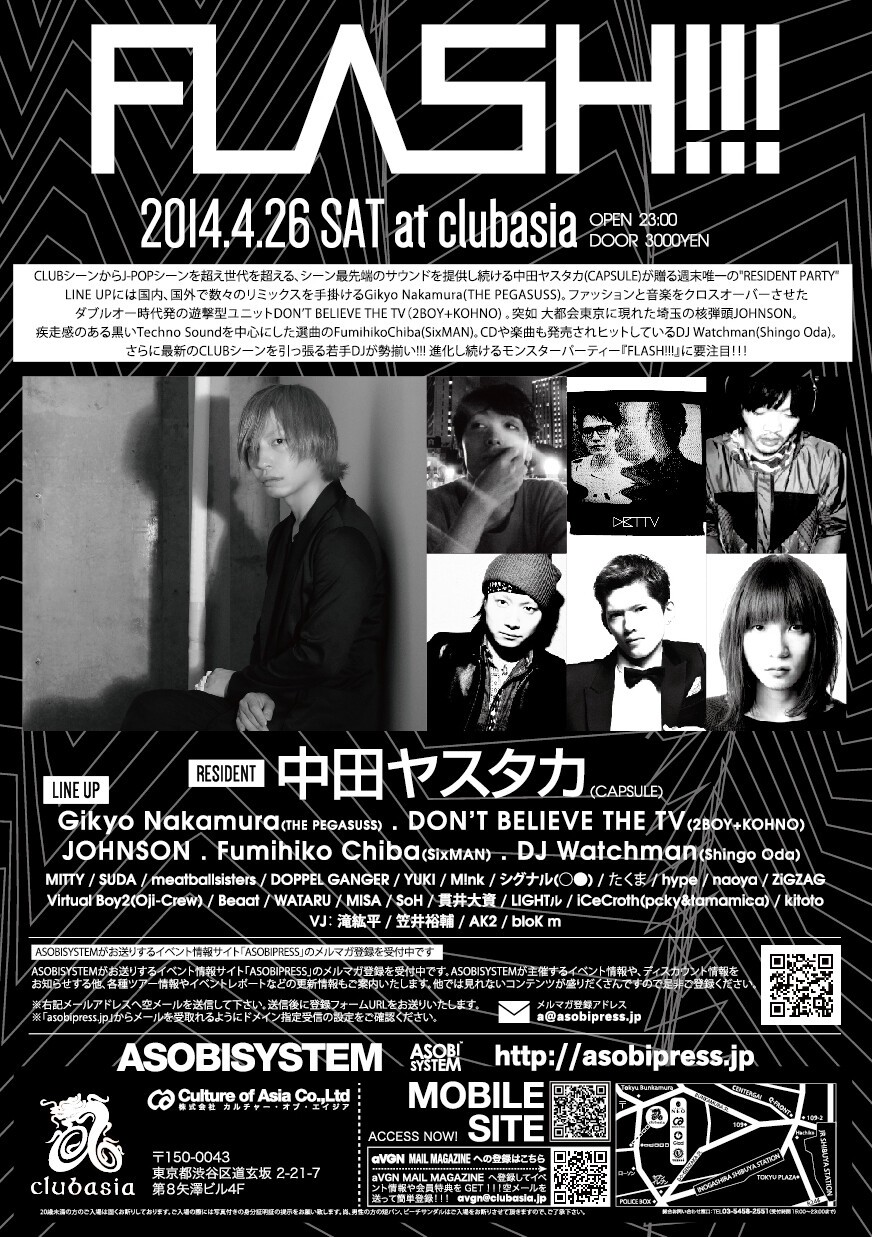 LINE UPには国内、国外で数々のリミックスを手掛けるGikyo Nakamura。ファッションと音楽をクロスオーバーさせたダブルオー時代発の遊撃型ユニットDON’T BELIEVE THE TV(2BOY+KOHNO) 。突如 大都会東京に現れた埼玉の核弾頭JOHNSON。疾走感のある黒いTechnoSoundを中心にした選曲のFumihikoChiba(SixMAN)。CDや楽曲も発売されヒットしているDJ Watchman(Shingo Oda)。青文字系モデルの活動を行うCLM(中田クルミ)。さらに最新のCLUBシーンを引っ張る若手DJが勢揃い!!!