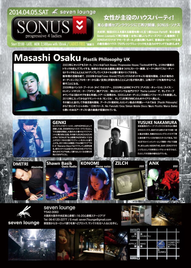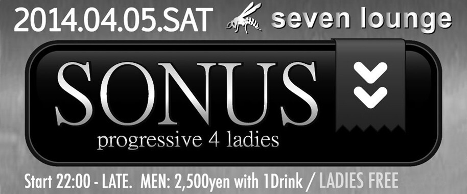 大好評、毎回400人を超える集客を誇った五つ星House Partyが、東心斎橋Seven Loungeにて再び開催!女性に優しいレディースフリー(別途1D)!SONUSオリジナル「テキーラ・ボール」の振舞いもあり、音楽はヨーロッパで主流の最先端のハウス・プログレッシヴミュージックを大迫力のサウンドでお送りします。
