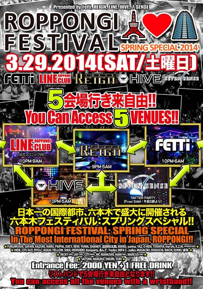 (3/29 土曜日: SATURDAY) 六本木フェスティバル・スプリングスペシャル: ROPPONGI FESTIVAL SPRING SPECIAL 2014 ☆5会場オールナイト行き来自由!!