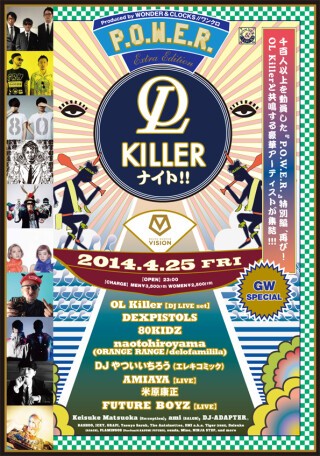 モンスターイベント『P.O.W.E.R.』のエクストラエディションとして、ビッグパーティ『OL Killerナイト!!』が再び開催される。今年1月に1100人以上を動員した前回に続き、今回もそのヘッドライナーを務めるのはもちろん、OL Killer。カリスマ的人気を誇るスーパースターも参加する3人組DJユニットが、ハウス・クラシックス、最新テクノ、エレクト、さらにはディスコやファンク、歌謡曲までを奔放に操る。そして、OL Killer からの指名のもと、DEXPISTOLSや80KIDZを筆頭に、ORANGE RANGE/delofamililaとして活躍するnaotohiroyama、お笑いコンビ:エレキコミックとしても活躍するDJやついいちろう、ファッション界でも広く知られる双子ユニット:AMIAYAなどジャンルの壁を越えた異色のラインナップが実現。ハウス、エレクトロ、ヒップホップ、さらにはEDMまで異種サウンドが刺激的に交錯するスペシャルパーティにて、OL Killerとその仲間たちがとびきりアグレッシヴなパフォーマンスを披露する!!