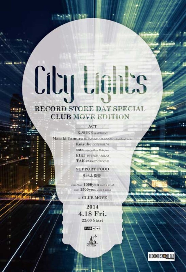 Do it JAZZ! を京都にて主催する"MASAKI TAMURA"、COTSWOLDSにてFUNK、SOULをこよなく愛する"Keisuke"、ReEDIT、DISCO DUB等、MADな四つ打ちを愛する"sota”が中心となり、京都の食・酒・音・読発信の場"リベル食堂"にて開催されている、食とお酒と音楽の総合エンターテイメント“City Lights”が滋賀CLUB MOVEにて開催。 目指すは滋賀と京都のグッド・ミュージックの共有。 もちろん滋賀からはCLUB MOVEのボス、"K-SUKE(HARMONY)"が参戦! 滋賀を中心に活動する"TAK(PLANET GROOVE)"とともに、 この日は"レコードストア・デイ"ということで、アナログ愛あふれる戦士達がアナログ・レコード・オンリーにてPLAY!先着10名様にリベル食堂「名物特製からあげ」をプレゼント。