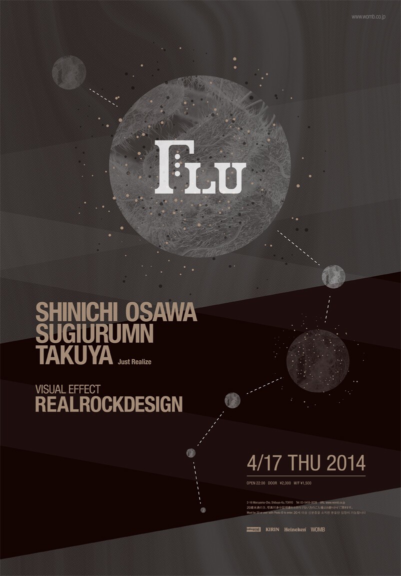SHINICHI OSAWA、REALROCKDESIGN、そしてオーガナイザー YASUHIRO ARAKI が主宰するパーティーとして昨年5月にスタートした FLU は、WOMB LOUNGE で隔月第3木曜に行なわれ、平日にも関わらず多くの来場者で賑わいを見せる新たなコンセプトパーティーとしてシーンで密かに話題を集めた。