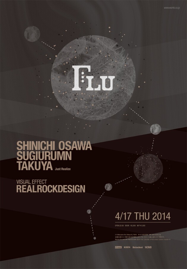 The party FLU which began last year in May, was supervised by SHINICHI OSAWA、REALROCKDESIGN and the organizer YASUHIRO ARAKI. It was held at the WOMB LOUNGE on the third Thursday of every other month. Despite being held on a weekday, many people attended, and at the scene of the new concept party where you could see the huge turn out, we took note of some of the major happenings. There was the proposal of the new sensual experience, by laying out carpet right from the entrance over the entire floor, and having people kick off their shoes before they kicked it up. Not only that, but thanks to REALROCKDESIGN the WOMB LOUNGE was remade into some kind of other dimension with a space effects presentation that used five projectors. Best of all, SHINICHI OSAWA and a guest artist did a fresh collaboration giving birth to a new groove which rocked everyone there and livened up the party even more. After taking a break to recover during winter, FLU will be starting again from this Spring. This year the party will be held regularly starting April, on every third Thursday of all the even numbered months. The guests for the first party of 2014 will be artists such as SUGIURUMN and Just Realize, with the currently hot TAKUYA making an appearance on stage.