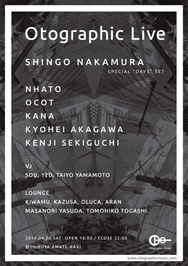 日本産・世界最高水準のサウンドを追求し、世界のTrance & Progressiveシーンで高評価を獲得して来た国産ダンスミュージックレーベル「Otographic Music」公式のパーティが再登場。2014年3月に発売したアルバム「Days」がBeatport Trance Top 100 Releasesの1位を記録したShingo Nakamuraをはじめとした、日本のTrance & Progressiveサウンドの最先端をゆくアーティスト達が極上の音空間をフロアに提供する。