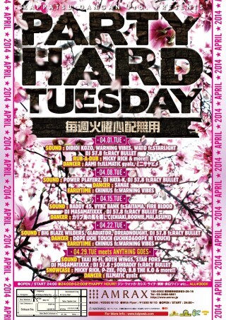 もともとは、AMRAXの前身の箱である、当時のCLUB SIMOONにて行われていた、『SIMOON LIGHT DANCE』を2006年4月いっぱい開き、2006年5月からCLUB UNITYにて行われ、タイトルも『PARTY HARD TUESDAY』とリニューアルし、ますますBIGなPARTYに!そして、2007年10月からはCLUB AMRAXに場所を改め、HOSTであるRACY BULLET & ENT DEAL LEAGUEと共に、毎週毎週、豪華なGUEST SOUND, ARTIST, DANCERを迎えて、引き続き行われている。毎週火曜は心配無用のBIG PARTY ! 『PARTY HARD TUEDAY』!!!