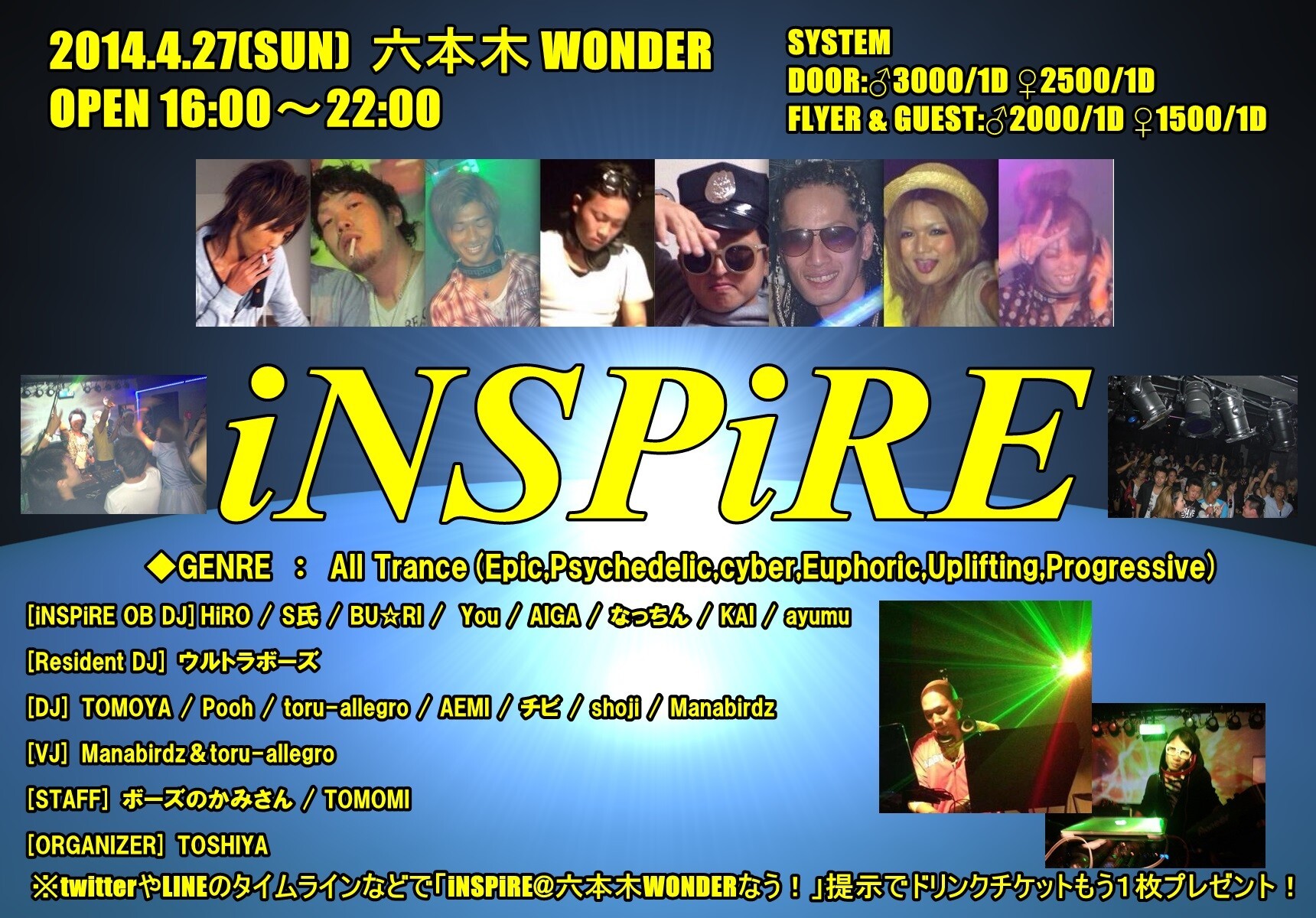 そして、2014年4月からのiNSPiREは「六本木WONDER」での開催となり、新年度1発目のiNSPiREは、過去に活躍したDJ達が帰って来ます!!!!