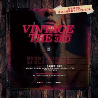 【毎週日曜VINTAGE】カモンリニューアルオープン記念で女性は終日完全入場無料&2Dプレゼント!!毎週日曜のカモンは関西主要CLUBで活躍中のメンバーが今流行のEDMを中心にHIP HOP、R&B、REGGAEなどわかりやすい選曲をお届けするEDM & ALL MIX PARTY『VINTAGE』☆☆