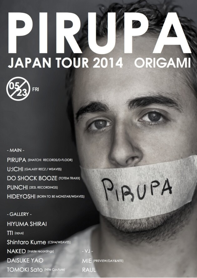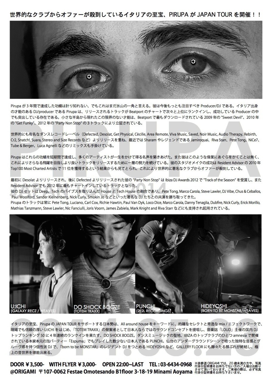 そしてイタリアの至宝、Pirupa の JAPAN TOUR をサポートする日本勢は、All around house をキーワードに、的確なセレクトと秀逸な mix / エフェクトワークで現場でも信頼の厚いU:ICHIをはじめ、「TOTEM TRAXX」の発案者として日本人ならではのサウンドコンセプトを提唱し、音楽誌「LOUD」主催の国内DJトップランキング 50 に 4 年連続のランクインを果たす、DO SHOCK BOOZE。ダンスミュージックの聖地、IBIZA のトップクラブのひとつ amnesia で開催 されている本家本元の泡パーティー「Espuma」でもプレイした数少ない日本人である PUNCHI。仙台のアンダーグラウンドシーンで培った独特な音感とグ ルーヴ感を持つ個性派DJで、『born to be MONSTAR』のレジデントDJをつとめる HIDEYOSHIなど、GALLERY FLOORにも錚々たる顔ぶれが終結し、極上の音世界を堪能出来るはず。