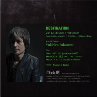2006年8月にMODULEでスタート、2009年7月にはイベント発のフリーペーパー“DESTINATION MAGAZINE” の創刊を経て、良質なクロスオーバー・サウンドを発信し続けてきたパーティ“DESTINATION”。次回はスペシャルゲストに福富幸宏を迎え、4/27(日)に開催。毎回大好評のModern Timesによるフードブースもお楽しみに!