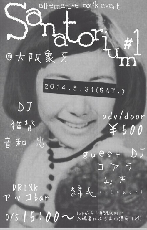 5/31(土) オルタナティブロックイベント 「 Sanatorium #1 」 DJ /猫背、音和 忠、コアラ、みき(やりほー)、綿毛(いまもとくん) o/s 15:00-(opから1時間以内ふるまい酒有り) ticket /\500 DRINK /アッコbar
