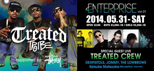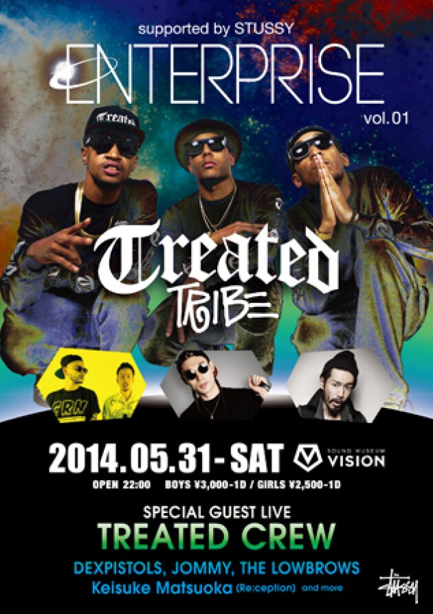 初夏のVISIONに吹き荒れる、ニューパーティラッシュ。STUSSYの力強いサポートを受け、この夜またもや新たなレギュラーイベント“Enterprise”が始動する。記念すべき初回に迎えるゲストはKanye WestのツアーDJ Million $ Mano率いるヒップホップ・グループTREATED CREWが日本初登場する。全米では多くのアーティストのレコメンドを受け、国内でもすでにトレンドセッターの間では、話題のクルーがどのようなパフォーマンスを披露するか楽しみだ。国内からもストリートアイコンである、DEXPISTOLSとJOMMYが登場し、フロアのエネルギーを沸点へと導いていく。
