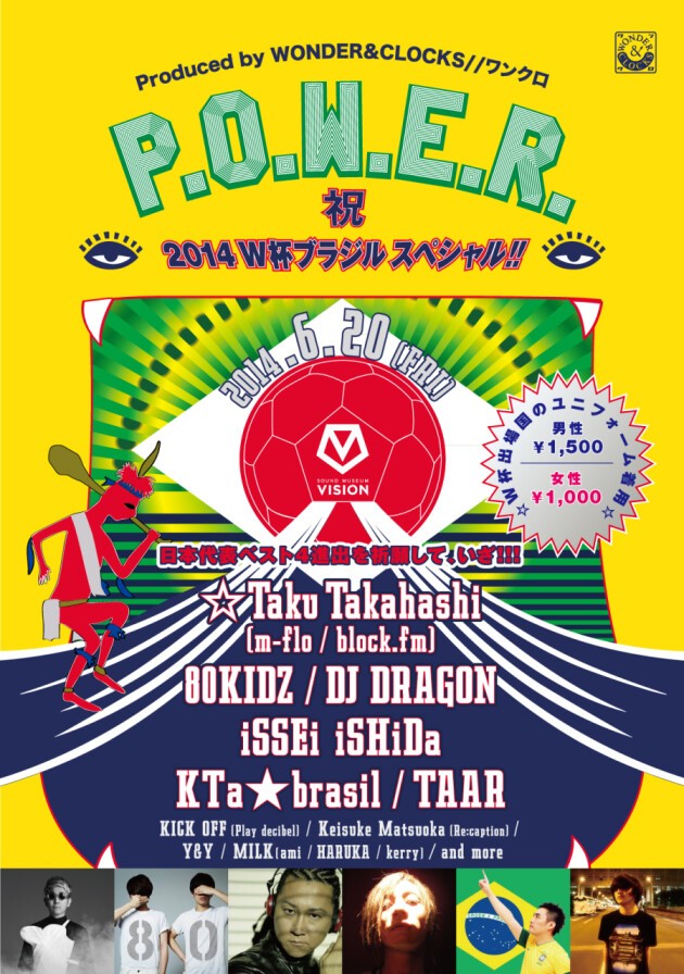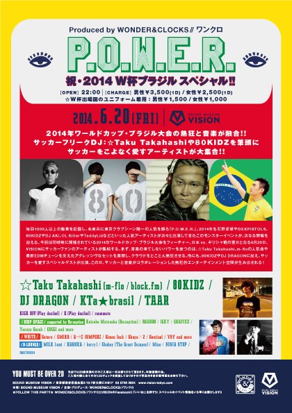 毎回1000人以上の動員を記録し、名実共に東京クラブシーン随一の人気を誇る『P.O.W.E.R.』。2014年も石野卓球やDEXPISTOLS、80KIDZやDJ AKi、OL KillerやTeddyLidなどといった人気アーティストが次々と出演してきたこのモンスターイベントが、次なる開催を迎える。今回は同時期に開催されている2014年ワールドカップ・ブラジル大会をフィーチャー。日本 vs. ギリシャ戦の翌日となる6月20日、VISIONにサッカーファンのアーティストが集結する。まず、音楽の果てしないパワーを放つのは、☆Taku Takahashi。m-floの人気曲や最新EDMチューンを交えたアグレッシヴなセットを展開し、クラウドをとことん熱狂させる。他にも、80KIDZやDJ DRAGONを筆頭に、サッカーを愛すスペシャルゲストが出演。この日、サッカーと音楽がコラボレーションした熱狂的エンターテインメント空間が生み出される!